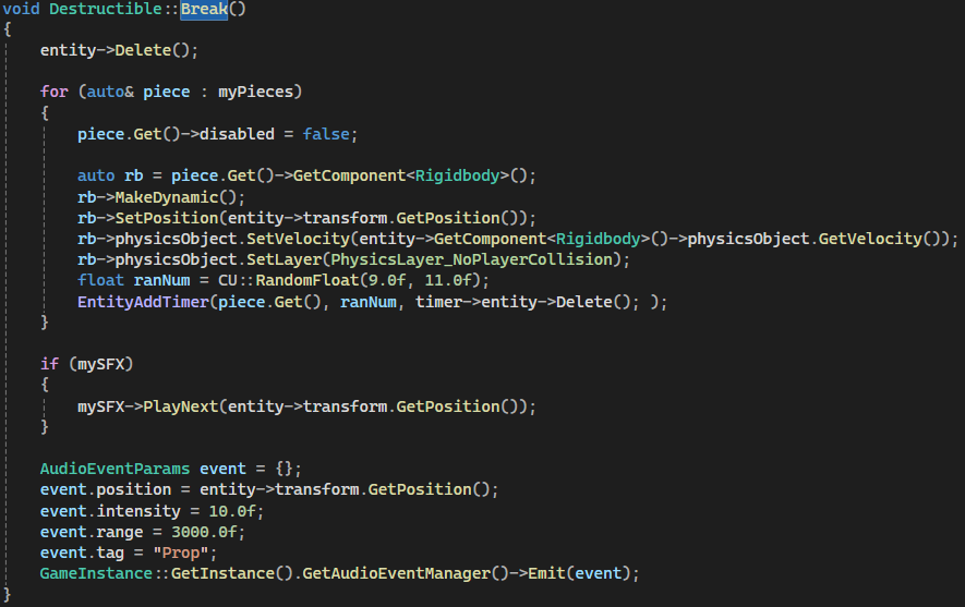 Finally breaking the object is done by deleting the original non destroyed object and activating all the pieces. I also send a Audio event here so the monster hears this extra well.